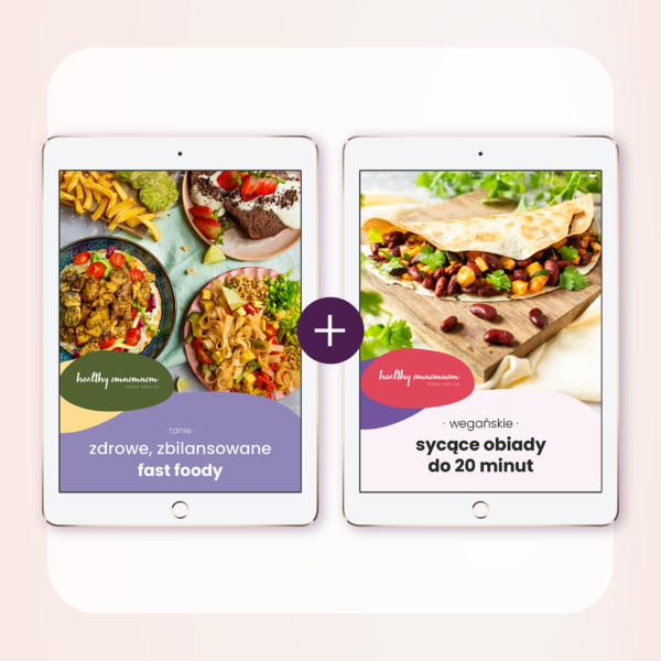 Dostajesz e-booki: Zdrowe, zbilansowane fast foody (30 wytrawnych obiadów, kolacji i lunchy oraz słodkie śniadania i desery), Sycące obiady do 20 minut (30 przepisów wytrawnych i na słodko). To łącznie 30 nowych przepisów i 30 przepisów z poprzednich jadłospisów.